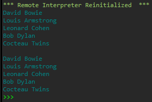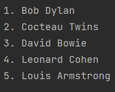 1 name_list = ['david bowie', 'louis armstrong', 'leonard cohen', 'bob dylan', 'cocteau twins'] 2 name_list =sorted(name_list) 3 i = 0 4 while i < len(name_list): 5 print(f'{i+1}'+'. '+name_list[i].title()) 6 i += 1 7 print()