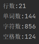 1 text='''The Zen of Python, by Tim Peters 2 3 Beautiful is better than ugly. 4 Explicit is better than implicit. 5 Simple is better than complex. 6 Complex is better than complicated. 7 Flat is better than nested. 8 Sparse is better than dense. 9 Readability counts. 10 Special cases aren't special enough to break the rules. 11 Although practicality beats purity. 12 Errors should never pass silently. 13 Unless explicitly silenced. 14 In the face of ambiguity, refuse the temptation to guess. 15 There should be one-- and preferably only one --obvious way to do it. 16 Although that way may not be obvious at first unless you're Dutch. 17 Now is better than never. 18 Although never is often better than *right* now. 19 If the implementation is hard to explain, it's a bad idea. 20 If the implementation is easy to explain, it may be a good idea. 21 Namespaces are one honking great idea -- let's do more of those!''' 22 x=len(text.splitlines()) 23 y=len(text.split()) 24 z=len(''.join(text)) 25 m=text.count(' ') 26 print(f'行数:{x}\n单词数:{y}\n字符数:{z}\n空格数:{m}')