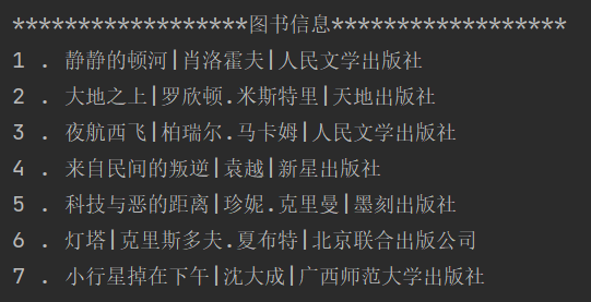 1 book_list = [['静静的顿河','肖洛霍夫','金人', '人民文学出版社'], 2 ['大地之上','罗欣顿.米斯特里','张亦琦', '天地出版社'], 3 ['夜航西飞', '柏瑞尔.马卡姆', '陶立夏', '人民文学出版社'], 4 ['来自民间的叛逆', '袁越', '','新星出版社'], 5 ['科技与恶的距离', '珍妮.克里曼', ' 詹蕎語', '墨刻出版社'], 6 ['灯塔','克里斯多夫.夏布特','吕俊君','北京联合出版公司'], 7 ['小行星掉在下午','沈大成', '', '广西师范大学出版社']] 8 t='图书信息' 9 print(f'{t:*^40}') 10 i=0 11 while i<len(book_list): 12 book_list[i].pop(2) 13 print(i+1,'.','|'.join(book_list[i])) 14 i+=1