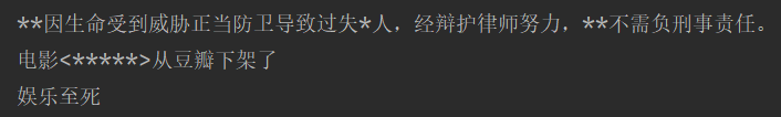 1 words_sensitive_list= ['张三', 'V字仇杀队', '杀'] 2 comments_list= ['张三因生命受到威胁正当防卫导致过失杀人,经辩护律师努力,张三不需负刑事责任。', 3 '电影<V字仇杀队>从豆瓣下架了', 4 '娱乐至死'] 5 comments_list='\n'.join(comments_list) 6 for i in words_sensitive_list: 7 if i in comments_list: 8 x=comments_list.index(i) 9 comments_list=comments_list.replace(comments_list[x:x+len(i)],'*'*len(i)) 10 print(comments_list)