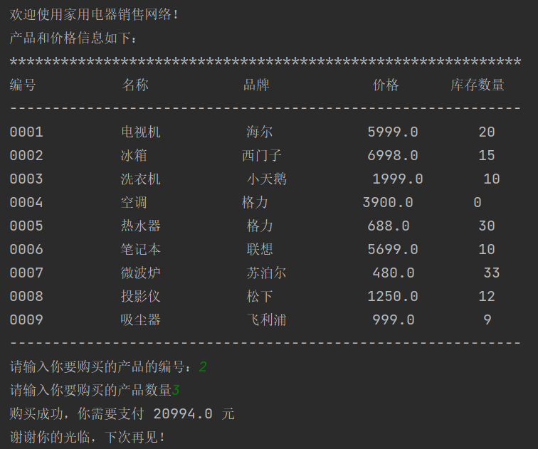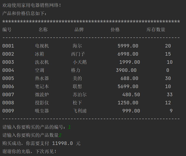1 """ 2 家用电器销售系统 3 v1.0 4 """ 5 6 #欢迎信息 7 print('欢迎使用家用电器销售网络!') 8 9 #商品数据 10 products=[ 11 ['0001','电视机', '海尔',5999.00,20], 12 ['0002','冰箱', '西门子',6998.00,15], 13 ['0003','洗衣机', '小天鹅',1999.00,10], 14 ['0004','空调', '格力',3900.00,0], 15 ['0005','热水器', '格力',688.00,30], 16 ['0006','笔记本', '联想',5699.00,10], 17 ['0007','微波炉', '苏泊尔',480.00,33], 18 ['0008','投影仪', '松下',1250.00,12], 19 ['0009','吸尘器', '飞利浦',999.00,9], 20 ] 21 22 #产品信息列表 23 print('产品和价格信息如下:') 24 print('*'*60) 25 m,n,x,y,z='编号','名称','品牌','价格','库存数量' 26 print(f'{m:<12}{n:<13}{x:<14}{y:<8}{z:<12}') 27 print('-'*60) 28 for i in products: 29 for i in i: 30 print(f'{i:<12}',end=' ') 31 print('',end='\n') 32 print('-'*60) 33 34 #用户输入信息 35 product_id = input('请输入你要购买的产品的编号:') 36 count = int(input('请输入你要购买的产品数量')) 37 38 #获取编号对应商品的信息 39 product_index=int(product_id)-1 40 product=products[product_index] 41 42 #计算金额 43 print('购买成功,你需要支付',product[3]*count,'元') 44 45 #退出系统 46 print('谢谢你的光临,下次再见!')