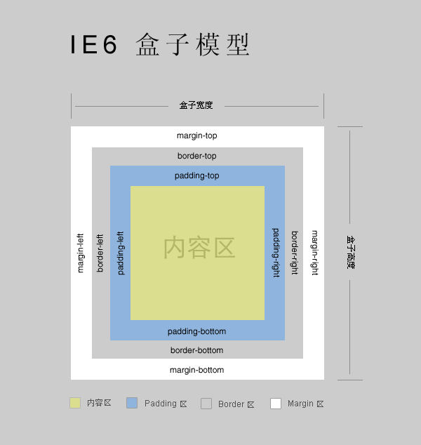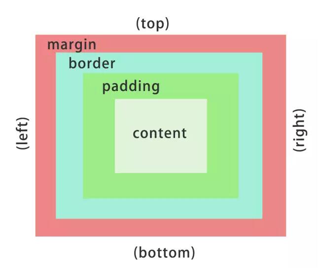 盒模型的组成:内容区(contetn)、补白/填充(padding)、边框(border)、边界/外边距(margin)。