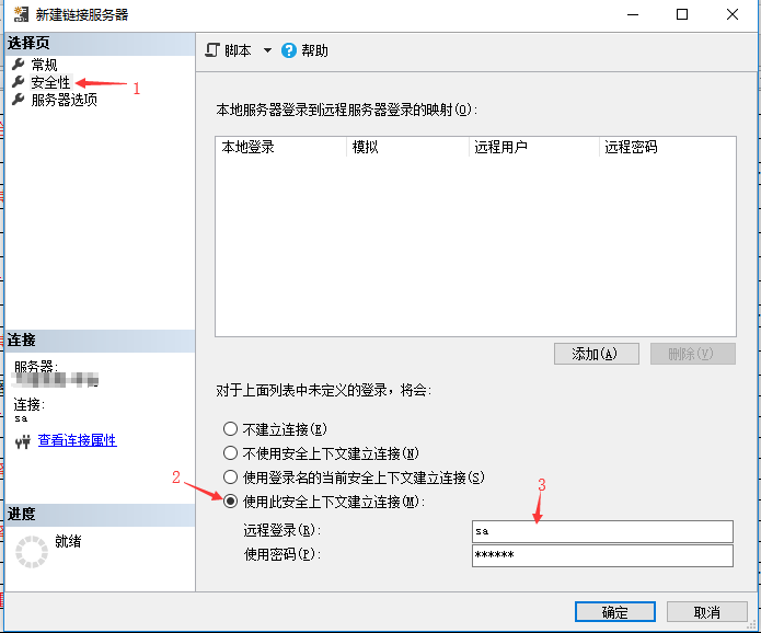 点击左侧的【安全性】,出现如下页面,在第3步中输入对方数据库的账号密码即可。如图3: