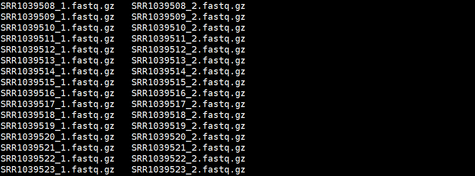 1 ls fastq | grep "_1" > gz1 2 ls fastq | grep "_2" > gz2 3 paste gz1 gz2>config_file 4 cat config_file