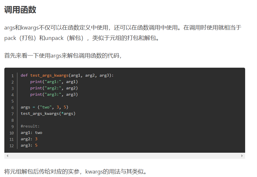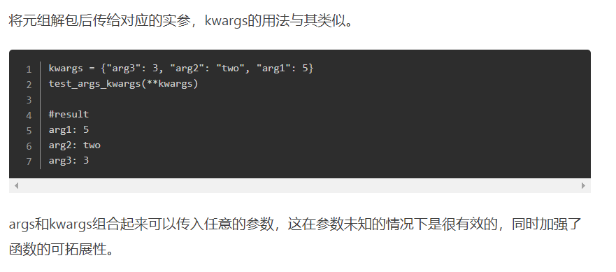 而**kwargs则是将一个可变的关键字参数的字典传给函数实参,同样参数列表长度可以为0或为其他值。下面这段代码演示了如何使用kwargs