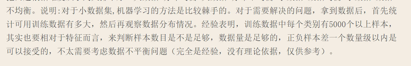 不平衡程度相同(即正负样本比例类似)的两个问题,解决的难易程度也可能不同,因为问题难易程度还取决于我们所拥有数据有多大。比如在预测微博互动数的问题中,虽然数据不平衡,但每个档位的数据量都很大——最少的类别也有几万个样本,这样的问题通常比较容易解决;而在癌症诊断的场景中,因为患癌症的人本来就很少,所以数据不但不平衡,样本数还非常少,这样的问题就非常棘手。综上,可以把问题根据难度从小到大排个序:大数据+分布均衡<大数据+分布不均衡<小数据+数据均衡<小数据+数据不均衡。说明:对于小数据集,机器学习的方法是比较棘手的。对于需要解决的问题,拿到数据后,首先统计可用训练数据有多大,然后再观察数据分布情况。经验表明,训练数据中每个类别有5000个以上样本,其实也要相对于特征而言,来判断样本数目是不是足够,数据量是足够的,正负样本差一个数量级以内是可以接受的,不太需要考虑数据不平衡问题(完全是经验,没有理论依据,仅供参考)。