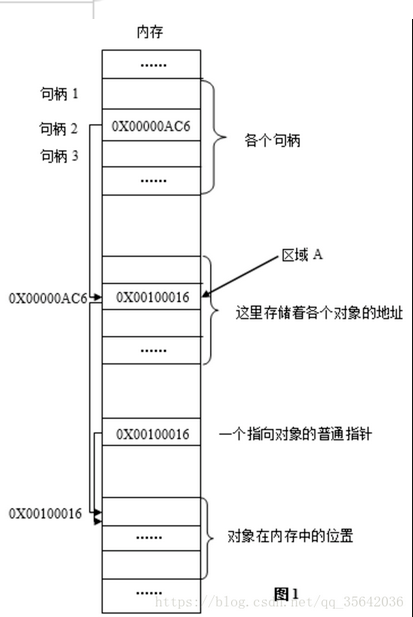 系统为每个进程在内存中分配一定的区域,用来存放各个句柄,即一个个32位无符号整型值(32位操作系统中)。每个32位无符号整型值相当于一个指针,指向内存中的另一个区域(我们不妨称之为区域A)。而区域A中存放的正是对象在内存中的地址。当对象在内存中的位置发生变化时,区域A的值被更新,变为当前时刻对象在内存中的地址,而在这个过程中,区域A的位置以及对应句柄的值是不发生变化的。这种机制,用一种形象的说法可以表述为:有一个固定的地址(句柄),指向一个固定的位置(区域A),而区域A中的值可以动态地变化,它时刻记录着当前时刻对象在内存中的地址。这样,无论对象的位置在内存中如何变化,只要我们掌握了句柄的值,就可以找到区域A,进而找到该对象。而句柄的值在程序本次运行期间是绝对不变的,我们(即系统)当然可以掌握它。