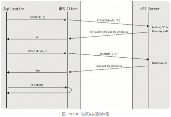 - NFS客户端向NFS服务端发送一个查找请求(LOOKUP(dirth, "f"),将文件句柄(dirth)和要读的文件名传递给远程文件系统。