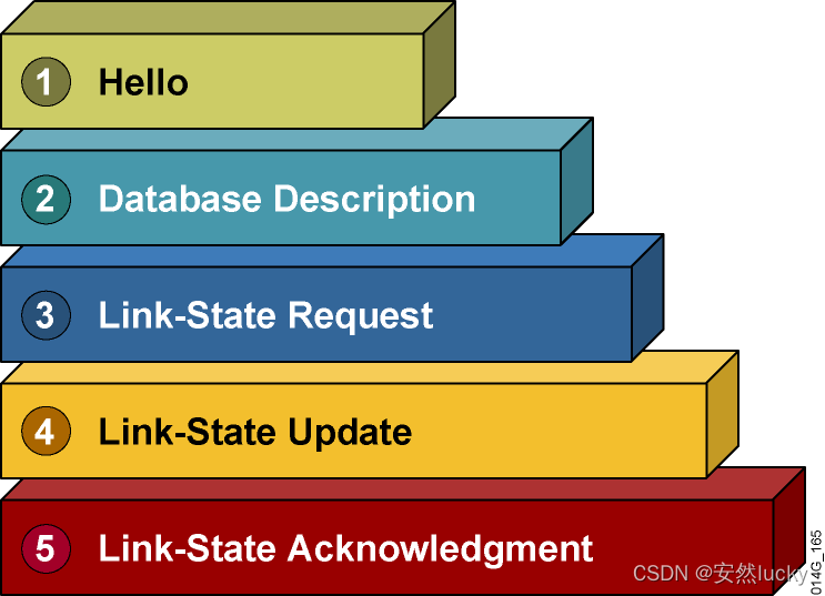 当邻居关系建立后,邻居间进行条件匹配,匹配失败,将保持为邻居关系;匹配成功,将建立为邻接关系,邻接关系将使用DBD/LSR/LSU/LSack来获取本地未知的所有LSA信息,同步生成数据库表---LSDB 链路状态数据库