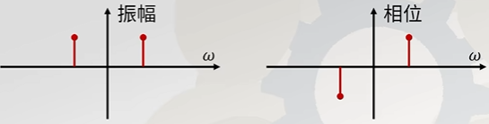 对于实数三角函数,在复指数形式上,在频率为\(\omega\)的点和频率为\(-\omega\)的点,振幅相等,相位相反。