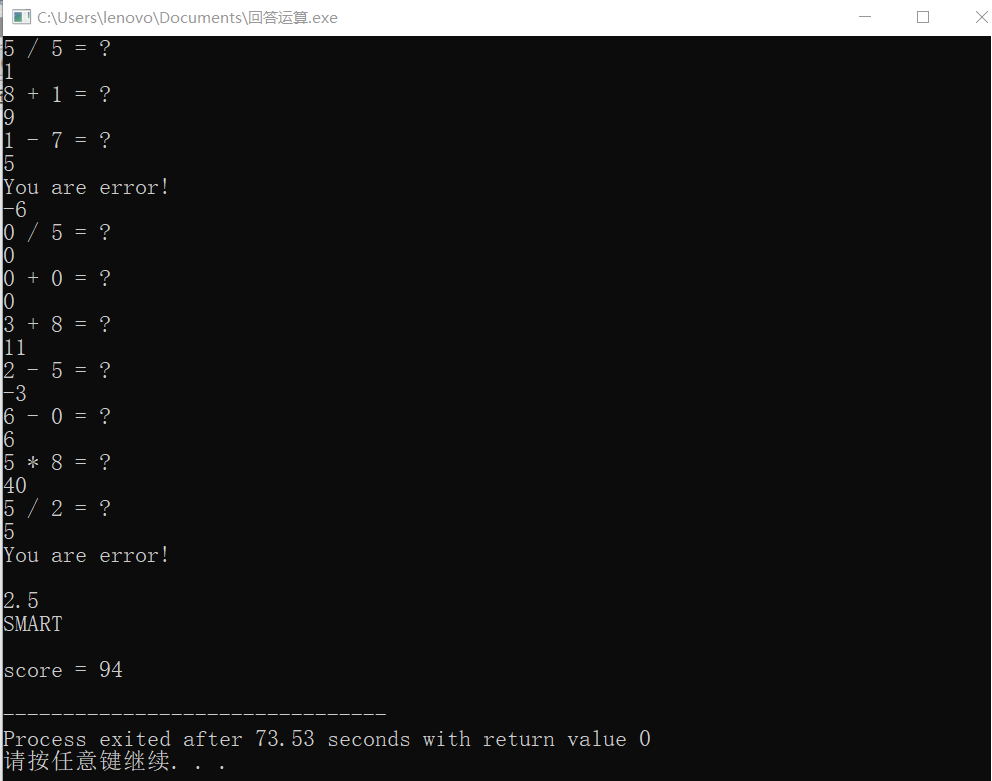 面向小学生随机选择两个整数形成四则运算算式要求学生解答,最后生成作答试卷保存到文本文件。 1、电脑随机出10道题,每题10分,程序结束时显示学生得分; 2、每道题学生有三次机会输入答案,当学生输入错误答案时,提醒学生重新输入,如果三次机会结束则给出正确答案; 3、对于每道题,学生第一次输入正确答案得10分,第二次输入正确答案得7分,第三次输入正确答案得5分,否则不得分; 4、总成绩90以上显示“SMART”,80-90显示“GOOD”,70-80显示“OK”,60-70显示“PASS”,60以下“TRY AGAIN”。 |