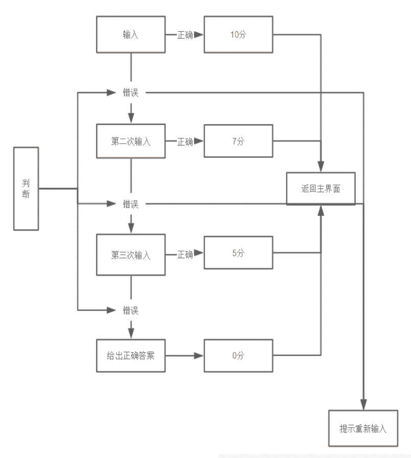 3、对于每道题,学生第一次输入正确答案得10分,第二次输入正确答案得7分,第三次输入正确答案得5分,否则不得分;