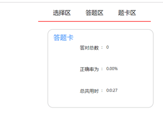 //判卷 function check(){ var duide = document.getElementsByClassName("duide");//要显示的正确答案 var daan=document.getElementsByClassName('daan');//后台获取的正确答案 var c = document.getElementsByClassName('c');//用户作答 var time=document.getElementById("time_id"); var x = document.getElementById('startShow'); //总计时间 var yesno = document.getElementsByClassName("yesno");//钩或叉 var ans = document.getElementsByClassName("ans");//“答案为:” var numRight=document.getElementById("numRight_id");//正确的个数 var rate = document.getElementById("Rightrate");//正确率 var yes = 0;//正确个数 var no =0; var count = 0;//总个数 for(var i=0;i<daan.length;i++){ if(daan[i].value==c[i].value){//若答对了 yesno[i].innerHTML="√"; yesno[i].style.color="#1DF126"; yes++; count++; }else{ yesno[i].innerHTML="×"; yesno[i].style.color="red"; //若错误,显示 "答案:正确的答案" ans[i].innerHTML = "答案:"; ans[i].style.display="inline-block"; duide[i].innerHTML = daan[i].value; duide[i].style.display="inline-block"; console.log(duide[0].innerHTML); no++; count++; } numRight.value=yes; time.value = x.innerHTML; var str = Number(yes/count*100).toFixed(2); str +="%"; rate.value = str; //将相应值通过input hidden 传到后台 } } <div class="ka"> <div class="titl">答题卡</div> <div class="line"> <div class="left">答对总数</div> <div class="mid">:</div> <div class="right"><%=request.getSession().getAttribute("corNum")%></div> </div> <div class="line"> <div class="left">正确率为</div> <div class="mid">:</div> <div class="right"><%=request.getSession().getAttribute("corRate")%></div> </div> <div class="line"> <div class="left">总共用时</div> <div class="mid">:</div> <div class="right"><%=request.getSession().getAttribute("time")%></div> </div> </div>