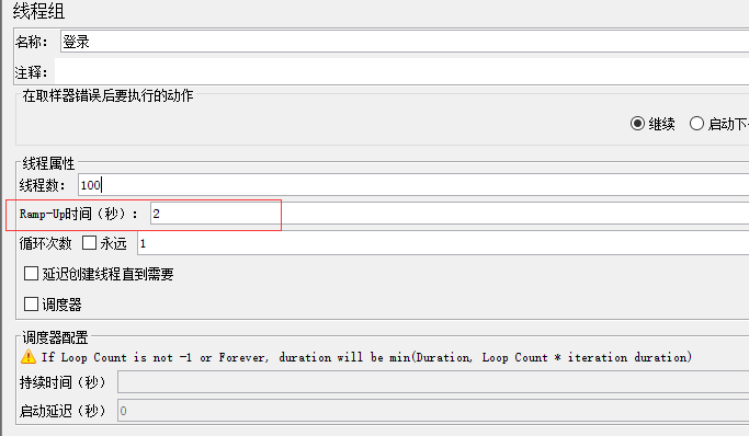 如果循环次数是 2 ,那么 jmeter 将在 2 秒之内发 送 200 个请求( 100*2 )