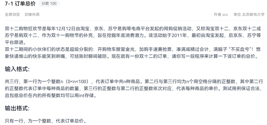 n个用空格分隔的正整数,其中第二行的正整数代表订单中每种商品的数量 - 第三行的正整数与第二行的正整数依次对应,代表每种商品的单价。