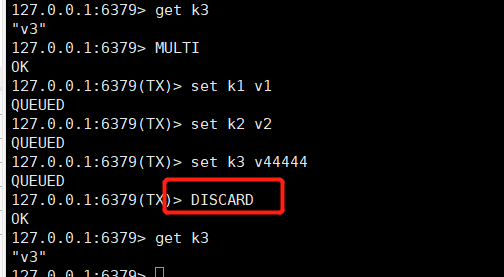 (1)discard:取消事务,放弃执行事务块内的所有命令