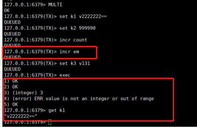 | 4.排它性 | redis会保证一个事务内的命令依次执行,而不会被其他命令插入 |