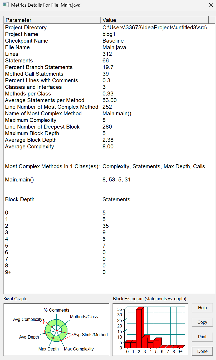最复杂方法: 是 Main.main() 方法,位于 252 行。其复杂度为 8 ,包含 53 条语句,最大块深度为 5,调用次数为 31 。说明该方法逻辑相对复杂,可能承担了较多功能,代码可读性和维护性可能面临挑战,可考虑进行功能拆分。