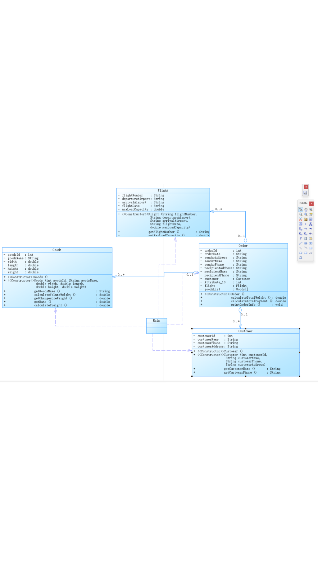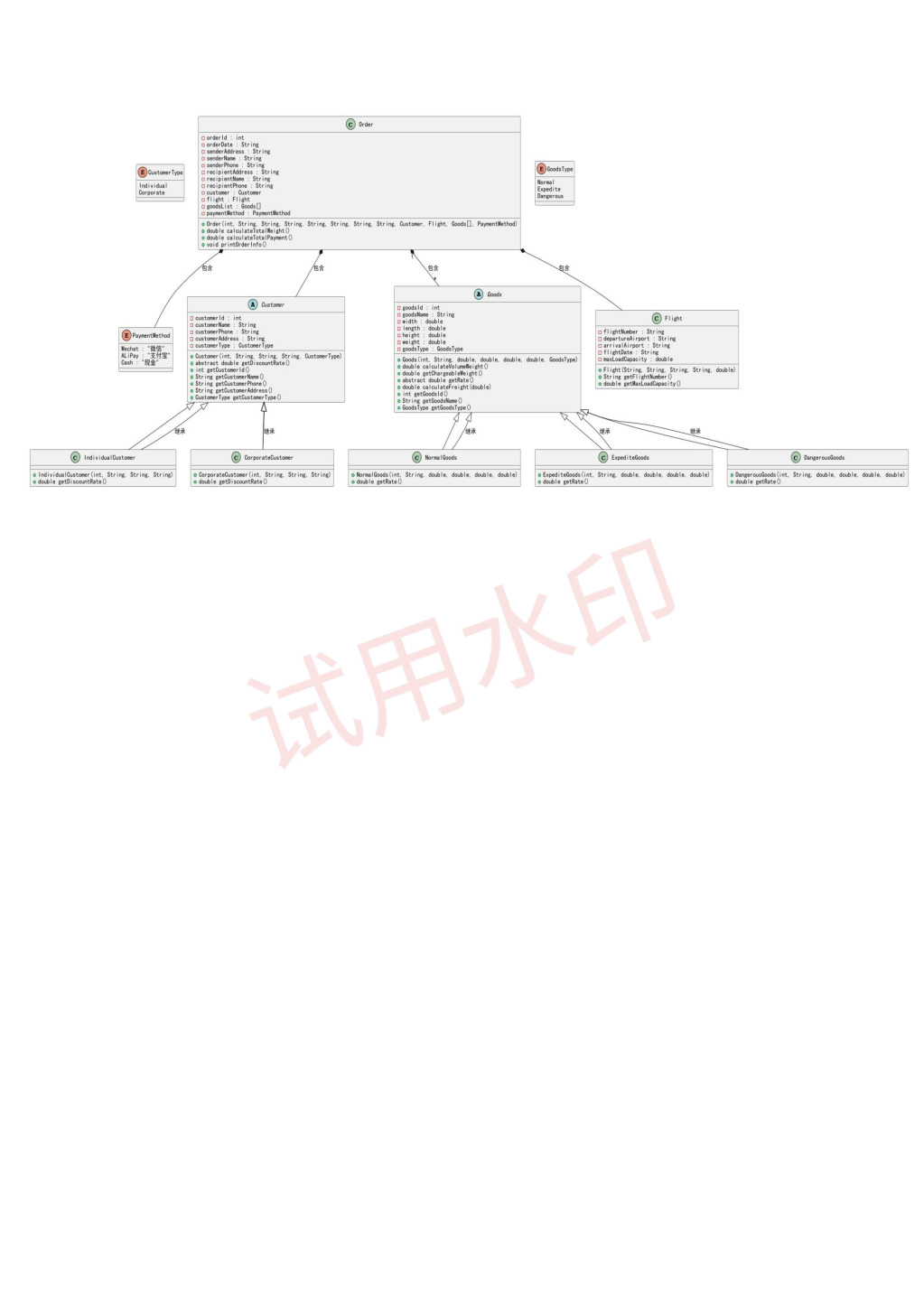 Order类:处理订单信息(订单号、日期、收发件人信息)、关联客户 / 航班 / 货物,并包含计算总重量、总费用和打印输出逻辑。