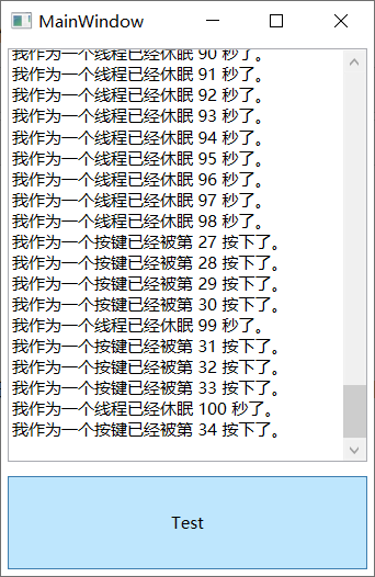 1 using System; 2 using System.Collections.Generic; 3 using System.Linq; 4 using System.Text; 5 using System.Threading; 6 using System.Threading.Tasks; 7 using System.Windows; 8 using System.Windows.Controls; 9 using System.Windows.Data; 10 using System.Windows.Documents; 11 using System.Windows.Input; 12 using System.Windows.Interop; 13 using System.Windows.Media; 14 using System.Windows.Media.Imaging; 15 using System.Windows.Navigation; 16 using System.Windows.Shapes; 17 18 namespace DlgtTest 19 { 20 /// <summary> 21 /// Interaction logic for MainWindow.xaml 22 /// </summary> 23 public partial class MainWindow : Window 24 { 25 // 声明委托类型,相当于C语言里面typedef一个函数指针类型 26 private delegate void UIUpdaterCallback(string what); 27 // 定义一个委托对象,它还没有被实例化 28 private UIUpdaterCallback mUpdateCallback; 29 30 private uint mButtonClickedCount = 0; 31 32 public MainWindow() 33 { 34 InitializeComponent(); 35 CtrlTextBox.Clear(); 36 37 // 将推脱对象实例化,实例化的构造函数传入的就是实际要被执行的函数 38 mUpdateCallback = new UIUpdaterCallback(UIUpdaterEntry); 39 40 // 创建并启动一个线程,它里面发消息给UI线程做更新 41 Thread t = new Thread(new ThreadStart(ThreadEntry)); 42 // 一定要设置 IsBackground 为 true,除非这个线程能够自动退出 43 t.IsBackground = true; 44 t.Start(); 45 } 46 47 private void UIUpdaterEntry(string what) 48 { 49 if (null == what) 50 { 51 CtrlTextBox.AppendText("空字符串消息\n"); 52 return; 53 } 54 CtrlTextBox.AppendText(what); 55 CtrlTextBox.ScrollToEnd(); 56 } 57 58 private void CtrlButton_Click(object sender, RoutedEventArgs e) 59 { 60 mButtonClickedCount++; 61 string msg = "我作为一个按键已经被第 " + mButtonClickedCount + " 按下了。\n"; 62 this.Dispatcher.Invoke(mUpdateCallback, new object[] { msg }); 63 } 64 65 private void ThreadEntry() 66 { 67 string msg; 68 uint count = 0; 69 70 while(true) 71 { 72 Thread.Sleep(1000); 73 count++; 74 msg = "我作为一个线程已经休眠 " + count + " 秒了。\n"; 75 this.Dispatcher.Invoke(mUpdateCallback, new object[] { msg }); 76 } 77 } 78 } 79 }