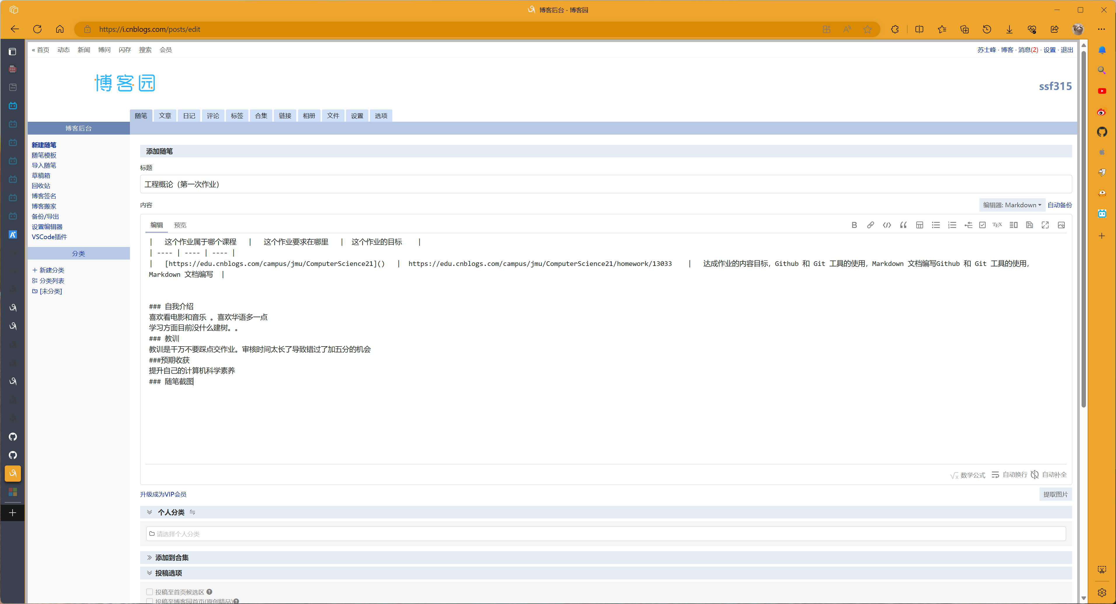 | https://edu.cnblogs.com/campus/jmu/ComputerScience21 | https://edu.cnblogs.com/campus/jmu/ComputerScience21/homework/13033 | 达成作业的内容目标,Github 和 Git 工具的使用,Markdown 文档编写Github 和 Git 工具的使用,Markdown 文档编写 |
