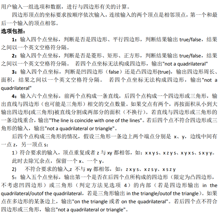 (2)踩坑心得:采用正则表达式可以减少判断格式的代码数量,不要在采用线段长度来判断是否为四边形(即两边与对角线构成三角形),这种方法存在问题,有些错误情况会被认为四边形。