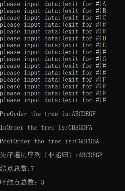 3、在上题中补充求二叉树中求叶子结点总数算法(提示:可在某种遍历过程中统计遍历的叶子结点数),并在主函数中补充相应的调用验证正确性。