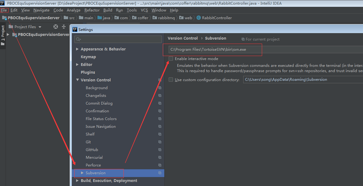 点击File -> Settings -> Version Control -> Subversion,在红框处选择svn.exe的路径