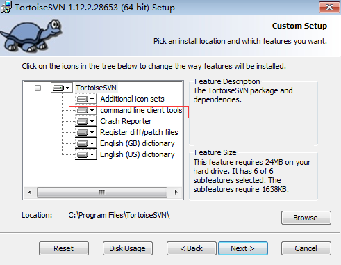 如果在bin目录下找不到svn.exe,原因为安装SVN客户端时,没有选择 command line client tools 这一项