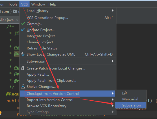 点击VCS -> Checkout from Version Control -> Subversion
