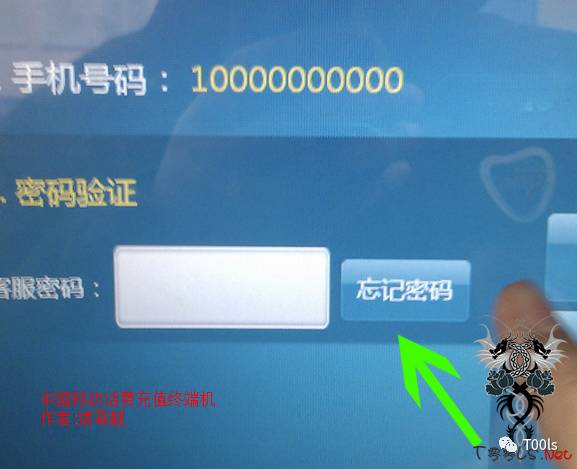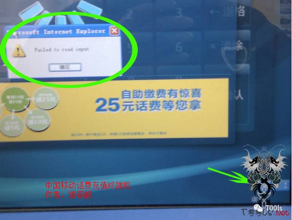 1.中国移动话费充值终端机,输入错误的手机号,并点击忘记密码,程序报错,同时右下角出现语言栏提示,点击提示即可调用本地资源管理器,从而进入系统。