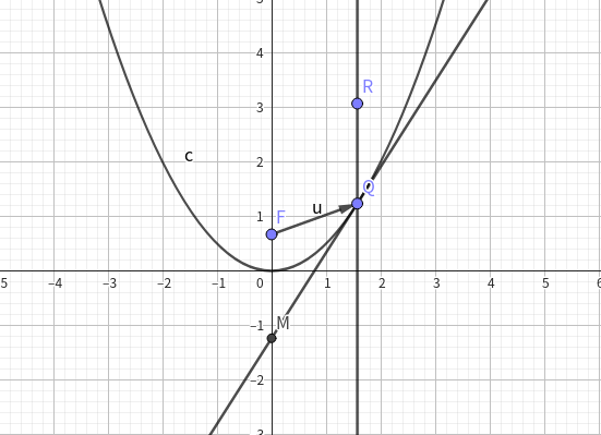 \(QR\) 为反射光线,过 \(Q\) 作抛物线切线 \(MQN\) 和法线 \(sQt.\) 由于 \(sQt\) 和 \(MQN\) 垂直,反射角等于入射角 \(\angle FQM = \angle RQN\)