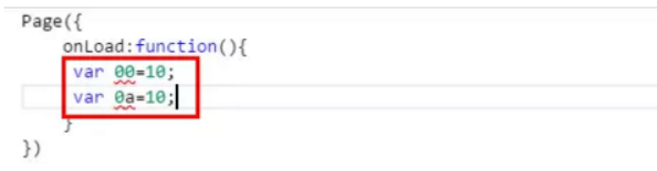 尽管JavaScript中可以使用中文字符命名,在微信开发工具(版本:0.10.102800)和手机(微信版本:6.3.30)上运行不会报错,但是此处并不建议使用中文命名。