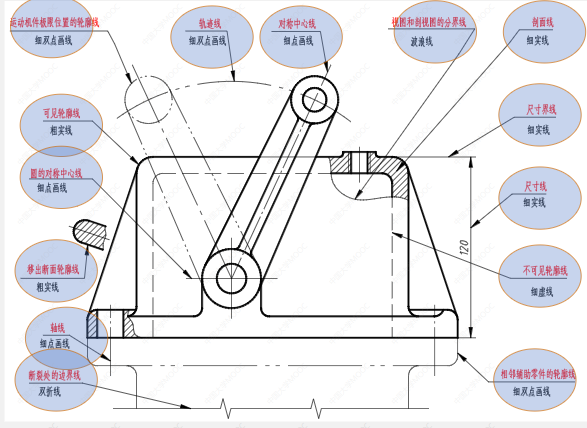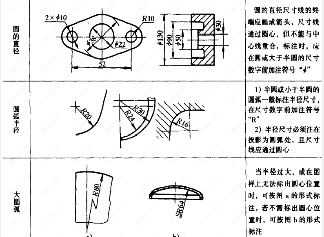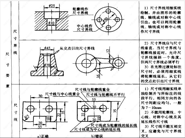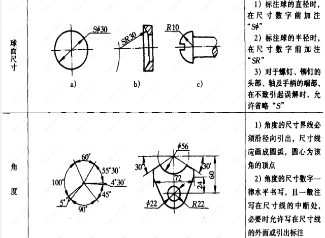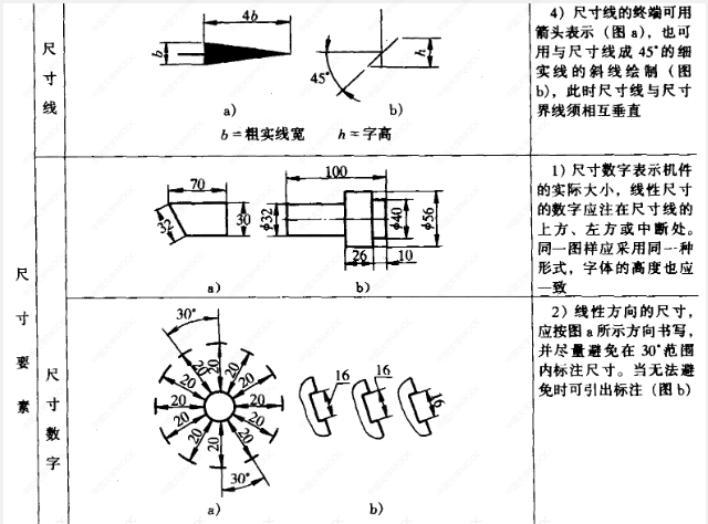 (2)注法:尺寸界线及尺寸线均用细实线绘制,尺寸界线可以用轮廓线、轴线及中心线代替;尺寸线不可代替;箭头的画法及数字的书写应符合标准,数字应注写在尺寸线上方并将字头应朝上,垂直方向时字头朝左,角度的数字应水平书写。