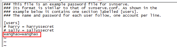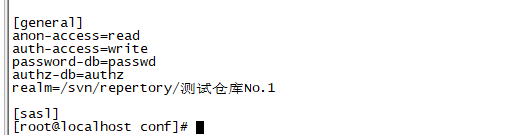 #匿名用户可读 anon-access = read #授权用户可写 auth-access = write #使用哪个文件作为账号文件 password-db = passwd #使用哪个文件作为权限文件 authz-db = authz # 认证空间名,版本库所在目录,需要写自己仓库目录 realm=/svn/repertory/测试仓库No.1