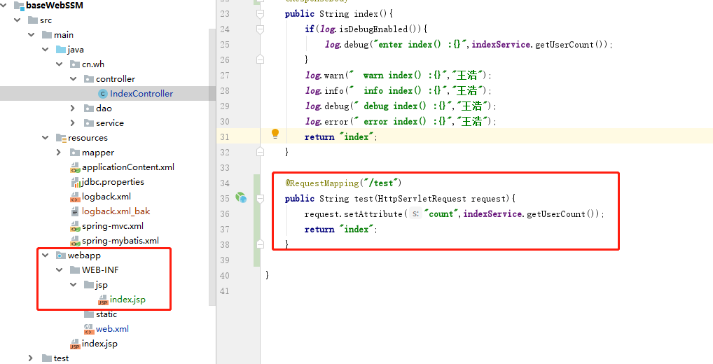 然后新建jsp文件夹与index.jsp页面。以及Controller 里面测试方法。