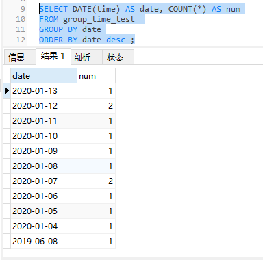 SELECT DATE(time) AS date, COUNT(*) AS num FROM group_time_test GROUP BY date ORDER BY date desc ;