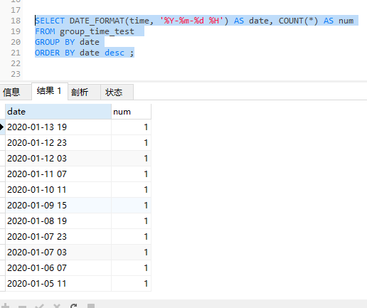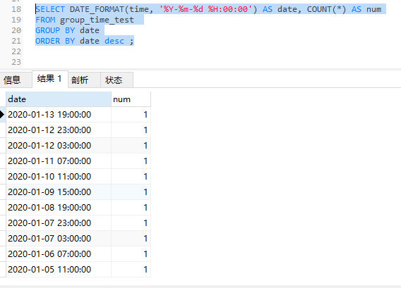 SELECT DATE_FORMAT(time, '%Y-%m-%d %H') AS date, COUNT(*) AS num FROM group_time_test GROUP BY date ORDER BY date desc ;