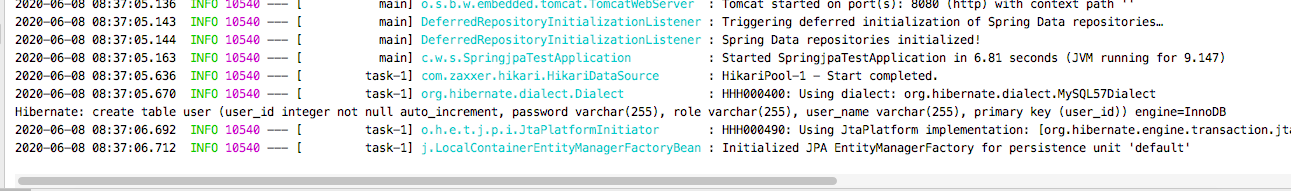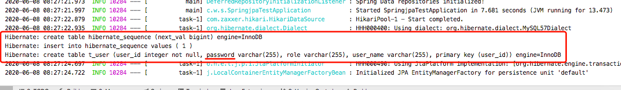 启动springboot项目后可以看到日志创建了序列当做自增并且列名一一对应。