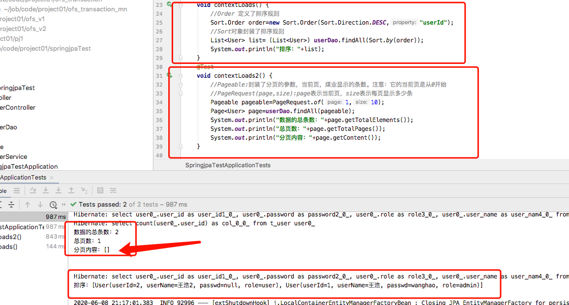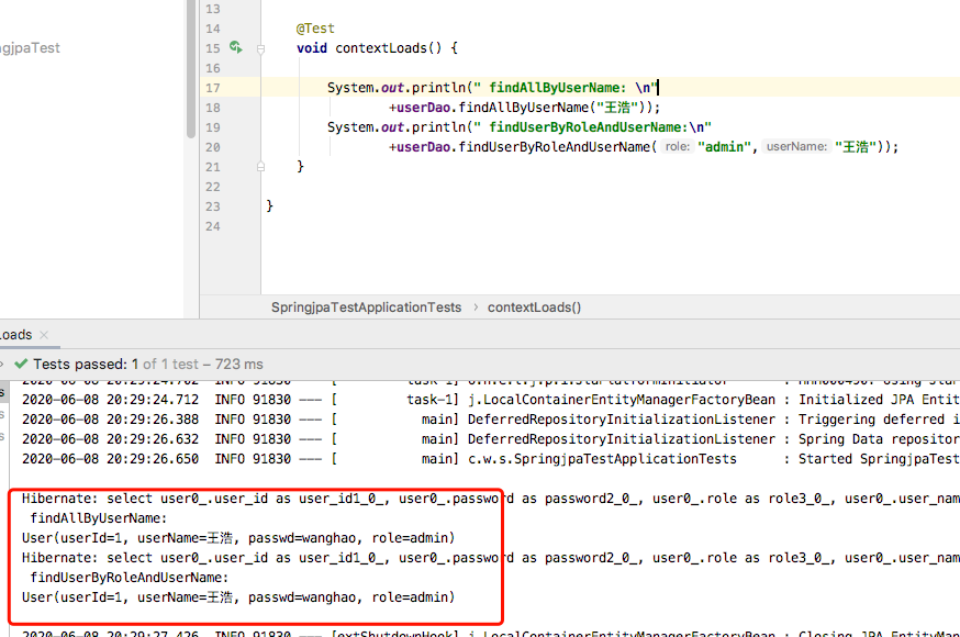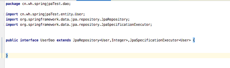 Specification<User> specification = new Specification<User>() { @Override public Predicate toPredicate(Root<User> root, CriteriaQuery<?> criteriaQuery, CriteriaBuilder criteriaBuilder) { List<Predicate> list=new ArrayList<>(); list.add(criteriaBuilder.equal(root.get("userName"),"王浩")); list.add(criteriaBuilder.equal(root.get("role"),"admin")); Predicate[] arr=new Predicate[list.size()]; return criteriaBuilder.and(list.toArray(arr)); } }; System.out.println(userDao.findAll(specification));