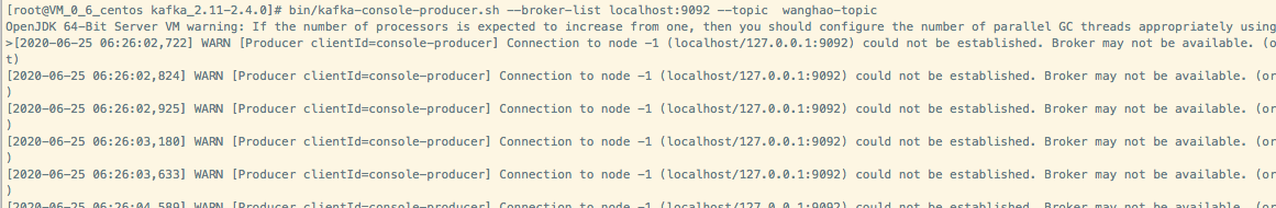 bin/kafka-console-producer.sh --broker-list 172.17.0.6:9092 --topic wanghao-topic
