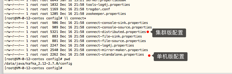 然后进入config目录进行配置文件修改,如下是connect的配置文件,有单机版和集群版,我们一般使用集群版
