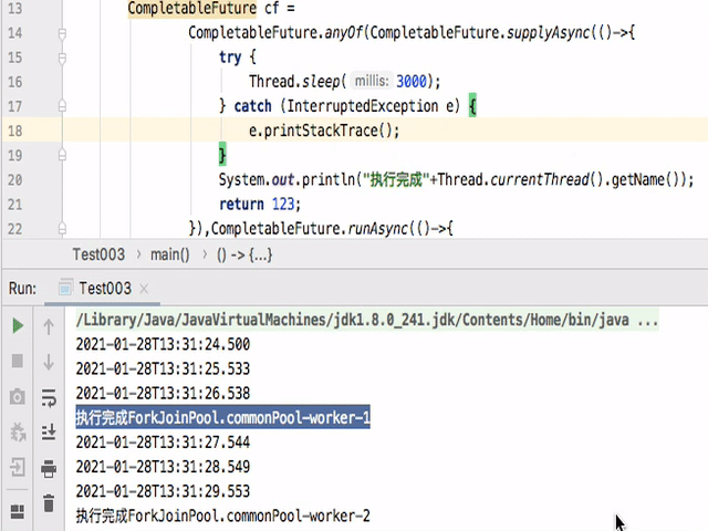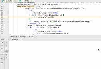 public static void main(String[] args) throws ExecutionException, InterruptedException { System.out.println(LocalDateTime.now()); CompletableFuture cf = CompletableFuture.allOf(CompletableFuture.supplyAsync(()->{ try { Thread.sleep(3000); } catch (InterruptedException e) { e.printStackTrace(); } System.out.println("执行完成"+Thread.currentThread().getName()); return 123; }),CompletableFuture.runAsync(()->{ for (int i = 0; i < 5; i++) { try { Thread.sleep(1000); } catch (InterruptedException e) { e.printStackTrace(); } System.out.println(LocalDateTime.now()); } System.out.println("执行完成"+Thread.currentThread().getName()); })); System.out.println(cf.get()); }