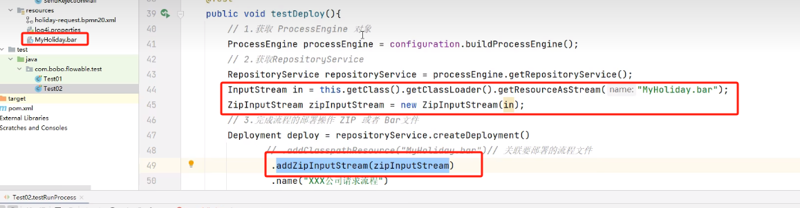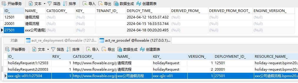 @Test public void testDeploy() { // 获取流程定义对象 ProcessEngine ProcessEngine processEngine = configuration.buildProcessEngine(); // 完成流程的部署操作 = act_re_deployment act_ge_bytearray act_re_procdef Deployment deploy = processEngine.getRepositoryService() .createDeployment() .addClasspathResource("holiday-request.bpmn20.xml") .name("请假流程") .deploy(); System.out.println("流程部署id:" + deploy.getId()); System.out.println("流程部署名称:" + deploy.getName()); }