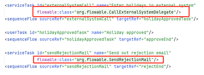 <?xml version="1.0" encoding="UTF-8"?> <definitions xmlns="http://www.omg.org/spec/BPMN/20100524/MODEL" xmlns:xsi="http://www.w3.org/2001/XMLSchema-instance" xmlns:xsd="http://www.w3.org/2001/XMLSchema" xmlns:bpmndi="http://www.omg.org/spec/BPMN/20100524/DI" xmlns:omgdc="http://www.omg.org/spec/DD/20100524/DC" xmlns:omgdi="http://www.omg.org/spec/DD/20100524/DI" xmlns:flowable="http://flowable.org/bpmn" typeLanguage="http://www.w3.org/2001/XMLSchema" expressionLanguage="http://www.w3.org/1999/XPath" targetNamespace="http://www.flowable.org/processdef"> <process id="holidayRequest" name="Holiday Request" isExecutable="true"> <startEvent id="startEvent"/> <sequenceFlow sourceRef="startEvent" targetRef="approveTask"/> <userTask id="approveTask" name="Approve or reject request"/> <sequenceFlow sourceRef="approveTask" targetRef="decision"/> <exclusiveGateway id="decision"/> <sequenceFlow sourceRef="decision" targetRef="externalSystemCall"> <conditionExpression xsi:type="tFormalExpression"> <![CDATA[ ${approved} ]]> </conditionExpression> </sequenceFlow> <sequenceFlow sourceRef="decision" targetRef="sendRejectionMail"> <conditionExpression xsi:type="tFormalExpression"> <![CDATA[ ${!approved} ]]> </conditionExpression> </sequenceFlow> <serviceTask id="externalSystemCall" name="Enter holidays in external system" flowable:class="org.flowable.CallExternalSystemDelegate"/> <sequenceFlow sourceRef="externalSystemCall" targetRef="holidayApprovedTask"/> <userTask id="holidayApprovedTask" name="Holiday approved"/> <sequenceFlow sourceRef="holidayApprovedTask" targetRef="approveEnd"/> <serviceTask id="sendRejectionMail" name="Send out rejection email" flowable:class="org.flowable.SendRejectionMail"/> <sequenceFlow sourceRef="sendRejectionMail" targetRef="rejectEnd"/> <endEvent id="approveEnd"/> <endEvent id="rejectEnd"/> </process> </definitions>