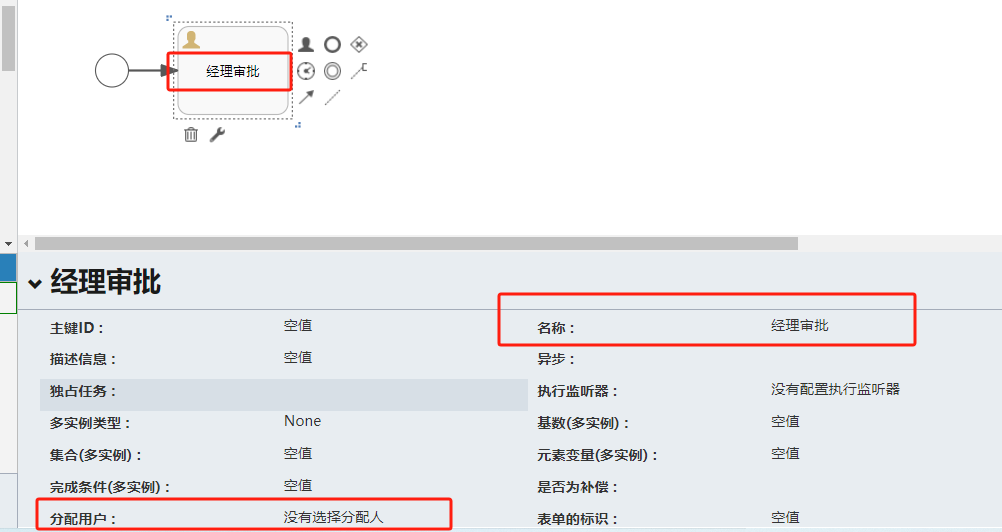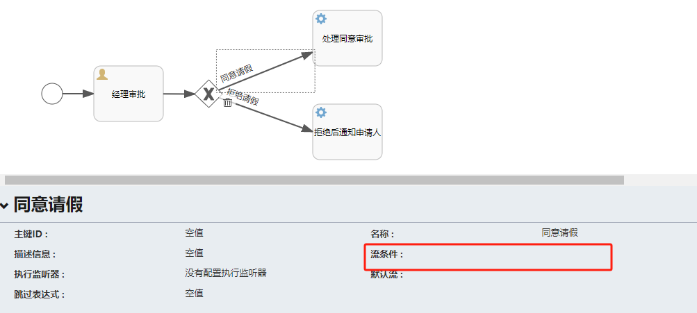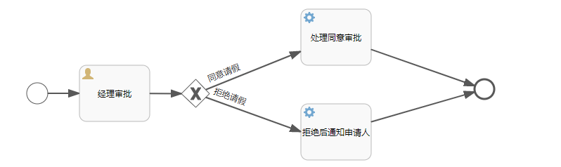 第一条是空开始事件,第二条是经理审批,第三天是网关,第四条是自动服务任务,第五条是结束事件