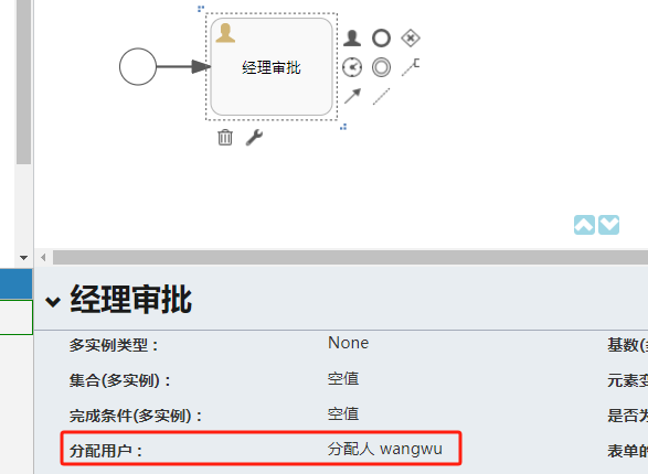 右侧就生成了个长方形方格,双击添加流程名称,或者下面菜单修改名称,然后再添加 分配用户 (那些人可以审核)我这里分配给wangwu