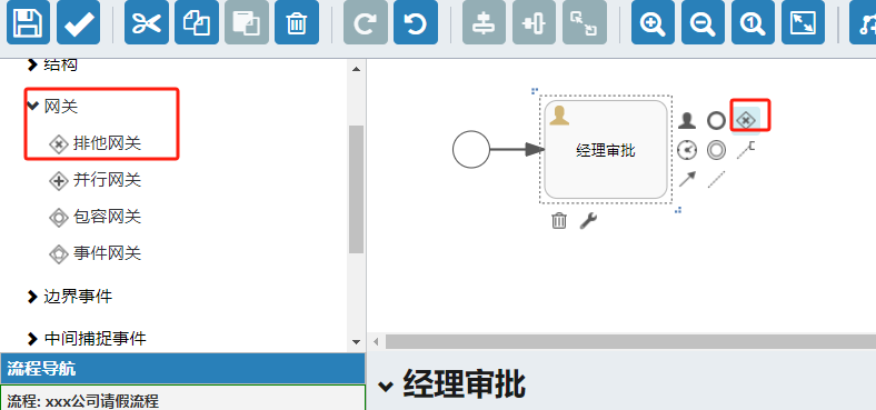 经理审批有多个状态,同意或者拒绝。所以下一个是个网关,