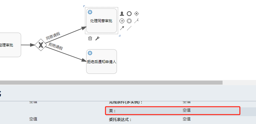 服务任务需要自己添加类,点击服务任务,然后找到下面菜单 类 选项输入我们处理同意审批后的类完整路径,